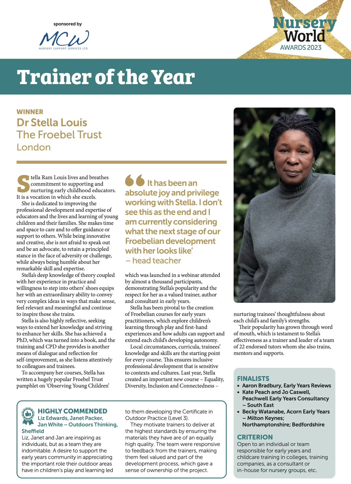 Dr Stella Louis, Lead Tutor of the Froebel Trust Short Courses, has been named 'Trainer of the Year' at the Nursery World Awards 2023. She was also honoured with the Nursery World Lifetime Achievement Award at this prestigious event.