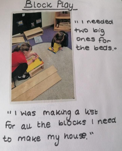 - Children shared record keeping in a floor book dedicated to block play. This encouraged discussion and reflection on learning.