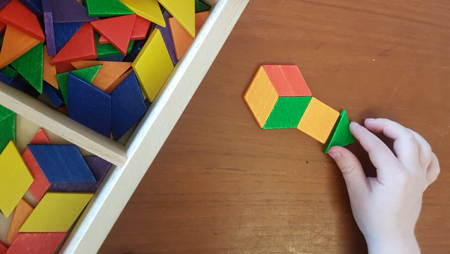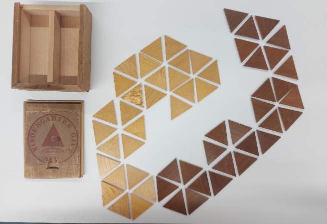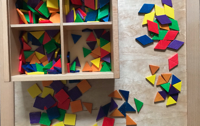 Parquetry allows children to play with sets of wooden tiles which can be arranged in geometric patterns and to create their own two-dimensional 'pictures'.